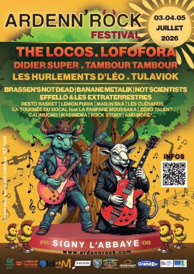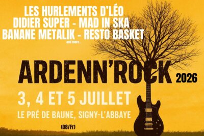 Festival de musique sur 3 jours au coeur de la commune de Signy-l'Abbaye, qui grandi d'année en année, l'édition 2026 promet encore plus de spectacle. Parmi les artistes à l’affiche de l'année 2026, Les Hurlements d'Léo, Didier Super, MAD IN SKA, Resto Basket, Banane Metalik... et bien d'autres. 2 scènes, entrée payante, buvette et restauration, réservation et infos sur www.ardennrock.com. Gratuit pour les - de 12 ans