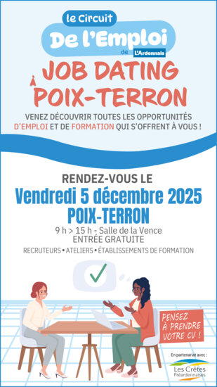 Le vendredi 5 décembre 2025, L’Ardennais organise un second job dating en partenariat avec les CrêtesPréardennaises. Dans la salle de la Vence, à Poix-Terron, entreprises et organismes de formation seront à la disposition des demandeurs d’emploi. Artisans, industriels, institutions, forces de l’ordre, organismes de formation, mission locale : entre 9 heures et 15 heures, il sera possible de faire le tour des stands des professionnels. L’entrée est gratuite. Et vous pourrez participer à des ateliers pour apprendre à faire un CV ou une lettre de motivation.