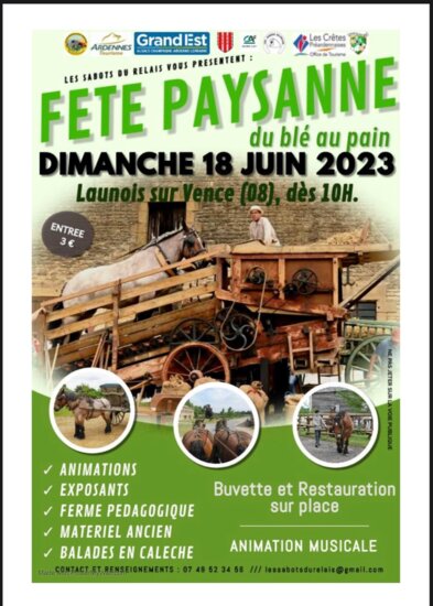 Fête paysanne du blé au pain organisée par Les Sabots du Relais. Plusieurs activités sur place : - Démonstrations d'outils et de machines anciennes - Travail avec chevaux ardennais - Ferme pédagogique - Animations musicale - Restauration rapide et buvette Tarifs d'entrée : 3 euros par personne Entrée gratuite pour les moins de 3ans